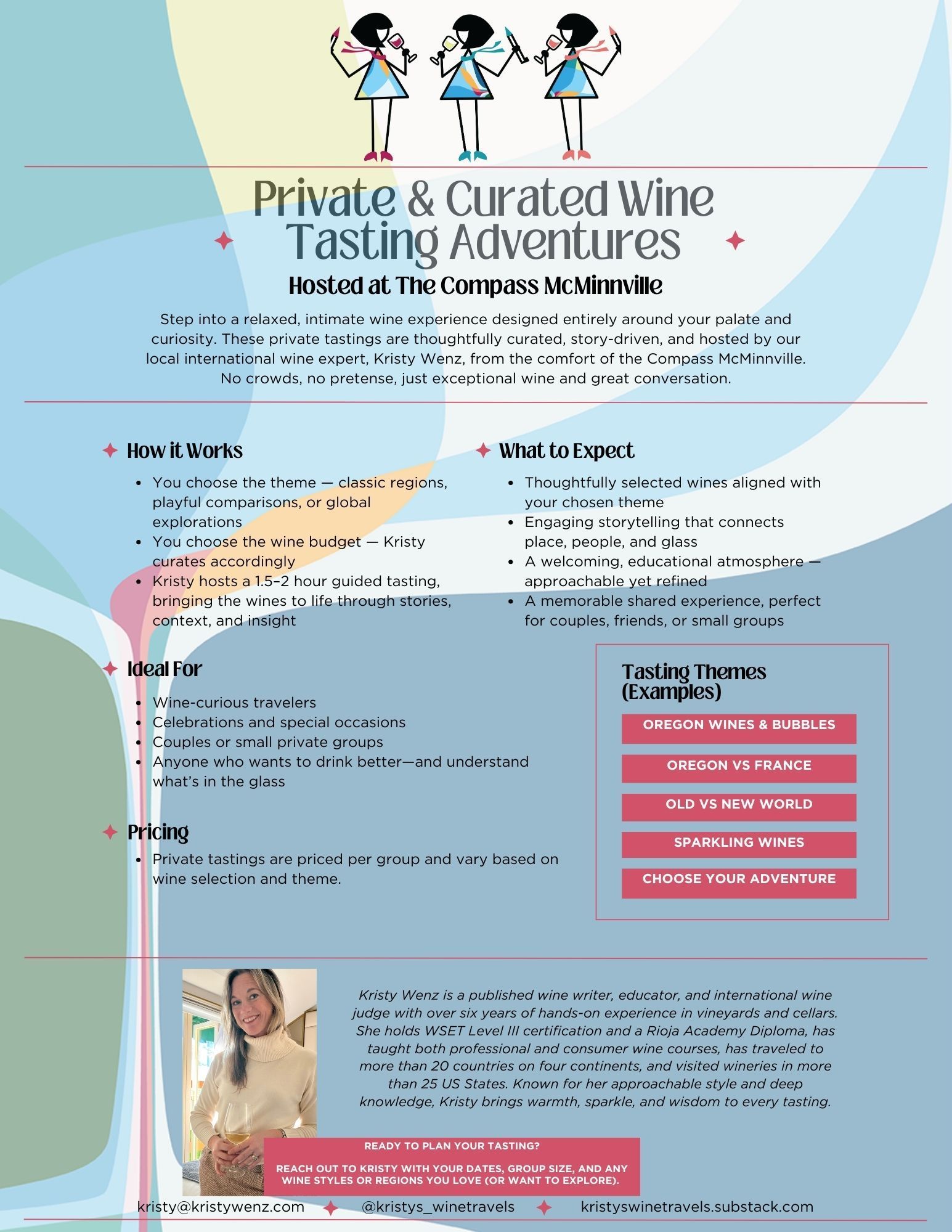 meet Kristy Wenz, mcminnville local, international wine judge, writer, and educator, now offering private on-site wine tastings at the compass.